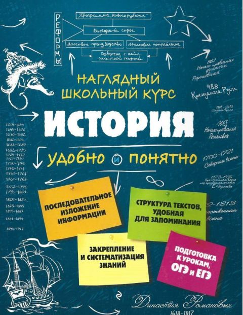 В наглядной и доступной форме приводятся сведения за весь школьный курс истории, основные даты и события.